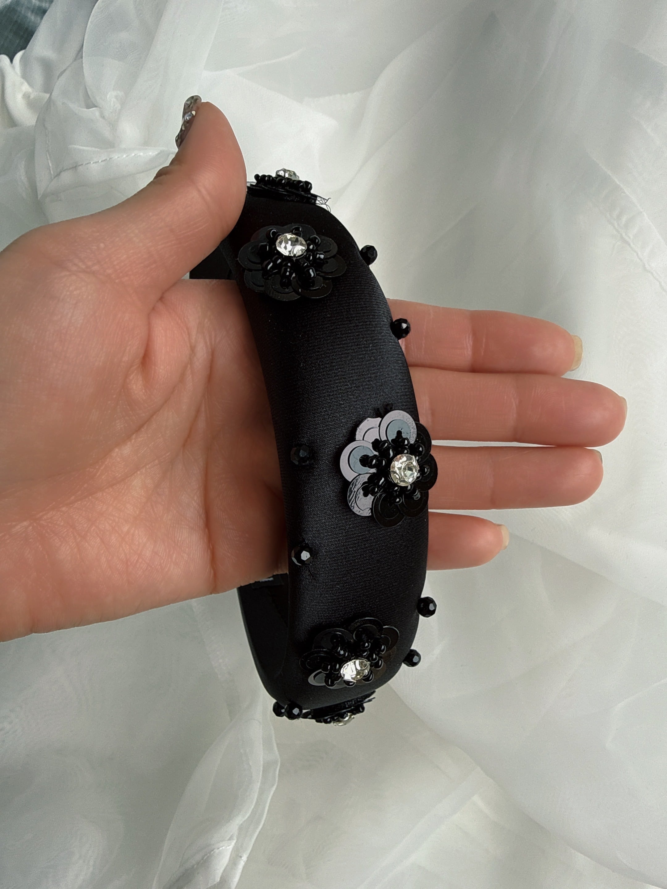 ベルベットにパールがついた細カチューシャ